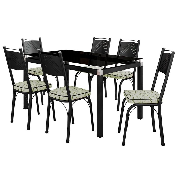 O Jogo de Mesa Malva Base 4118 de 140 cm Com 6 Cadeiras 151 Preto Fosco Assento Cedro Artefamol tem design arrojado, composto por uma mesa retangular com tampo de vidro temperado e acompanha 6 cadeiras com assentos revestidos com material sintético sendo fácil de limpar. Estrutura em aço carbono e acabamento em pintura epóxi com tratamento de fosfatização garantindo maior resistência a oxidação e fixação da pintura.