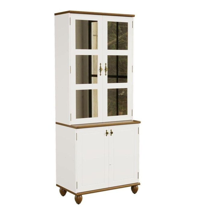 Características principais: -Base e tampos de madeira maciça Pinus Taeda reflorestada, com espessura de 25mm; -Pintura atóxica; -Puxadores padrão textura ouro envelhecido; -Pés robustos e torneados de madeira maciça de Pinus Taeda com nivelador; -Portas superiores com vidros reflecta lapidados; -Frente de portas inferiores com detalhe de linha baixo relevo; -Estrutura painéis fibra de madeira (MDF 15mm).
