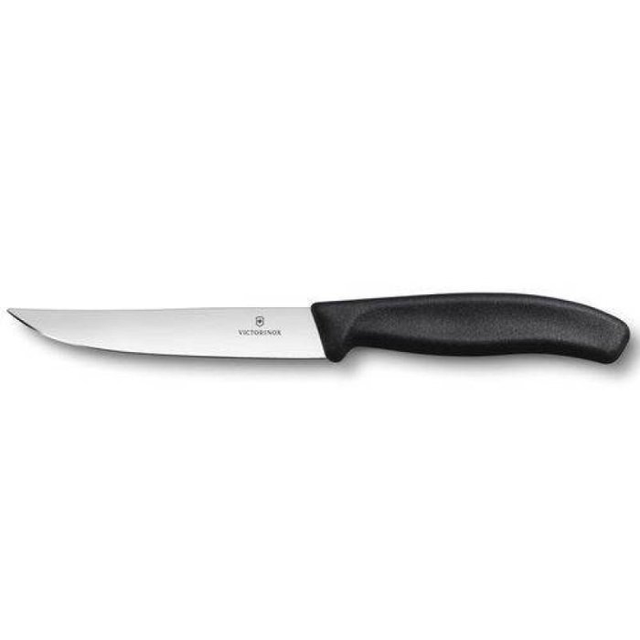 Faca Victorinox Swiss Classic preta de mesa para churrasco. Lamina em aço inox com excelente retenção de fio. Cabo ergonômico em polipropileno texturizado. Faca com ótimo custo beneficio. Fabricado na Suíça.