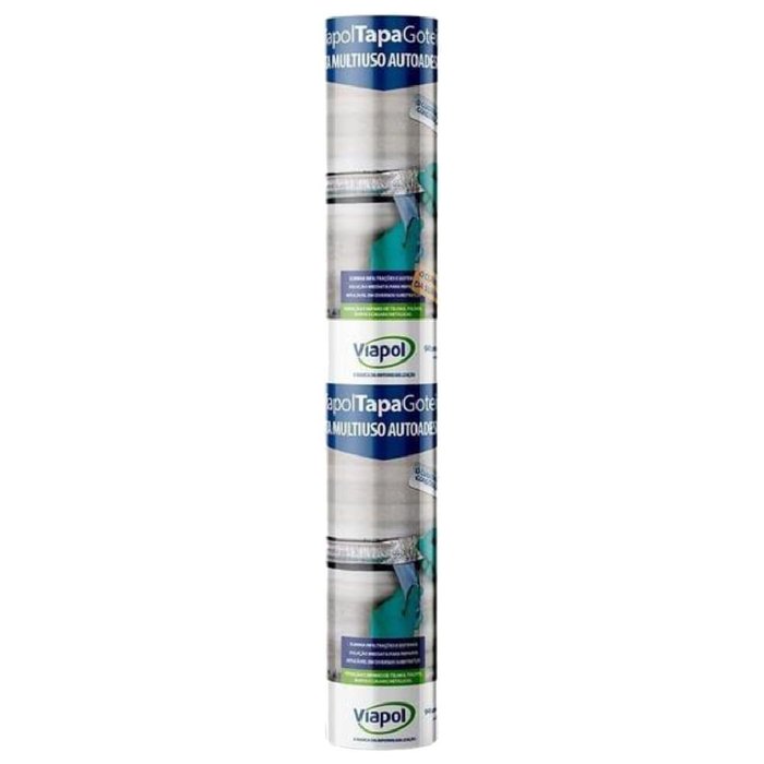 Viapol Tapa Goteira é uma fita multiuso autoadesiva flexível fabricada a base de asfalto modificado com adição de polímeros. Possui acabamento de filme de alumínio, assegurando durabilidade ao produto, reflexão dos raios solares e impermeabilidade.