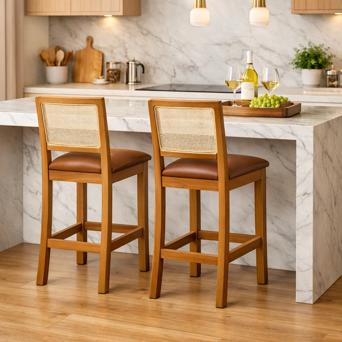 Kit 2 Banquetas Altas em Tela Sextavadas Assento Estofado Couro Pu Caramelo Rubi Madeira Maciça Mel