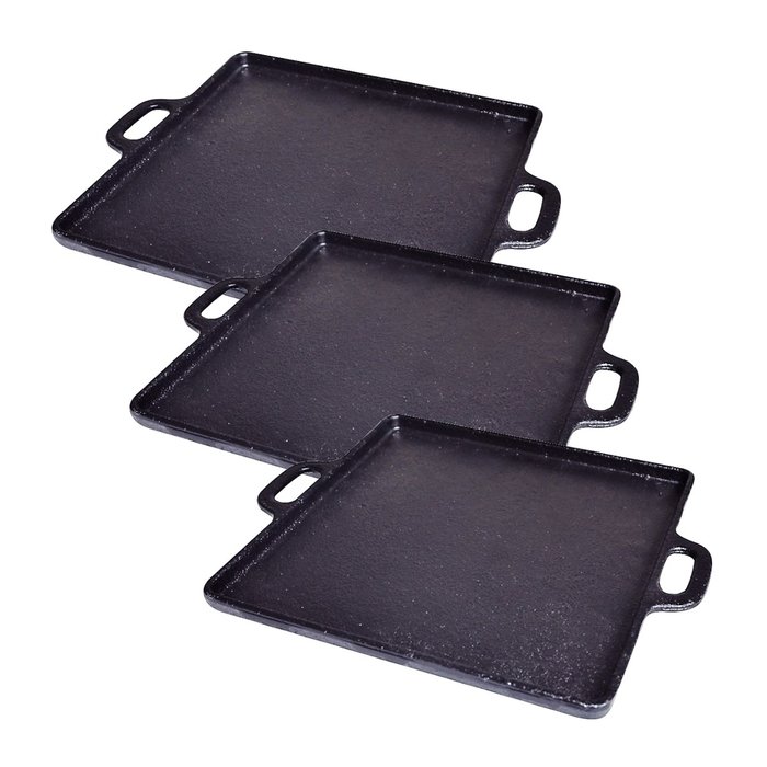 03 Bifeteira de Ferro Fundido Lisa Quadrada Alça Ferro 30x30cm.