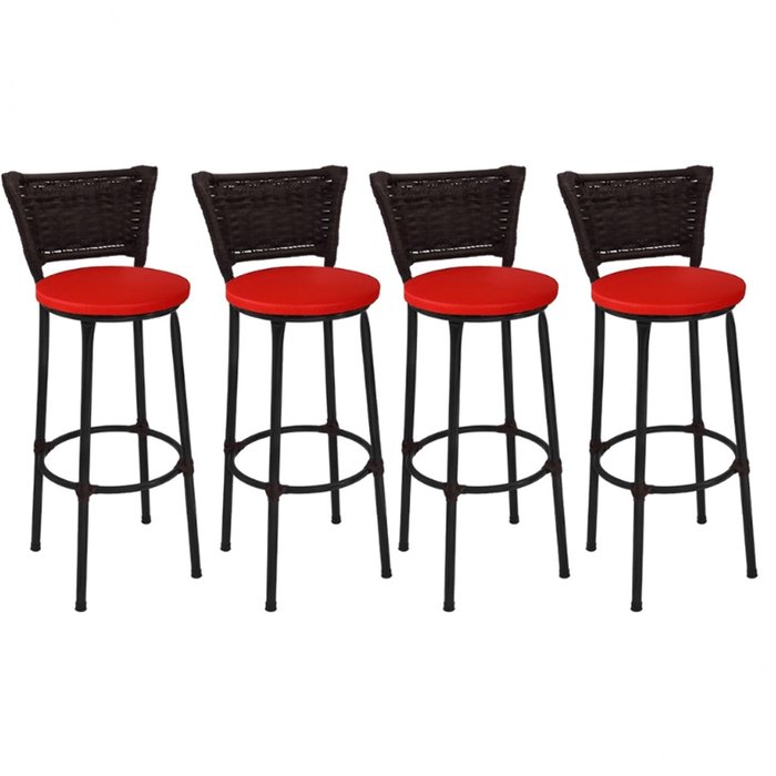 Kit 4 Banquetas Altas Preta com Encosto Junco Argila Assento Vermelho