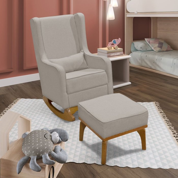 Poltrona Amamentação Aquila Retrô Linho Bege com puff Ideal