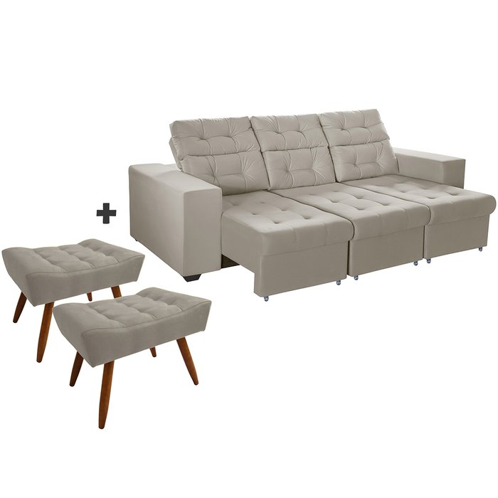 Sofá 3 Lugares Itália Plus 2,10m Retrátil, Reclinável, com 2 Puffs pés Palito, Bege