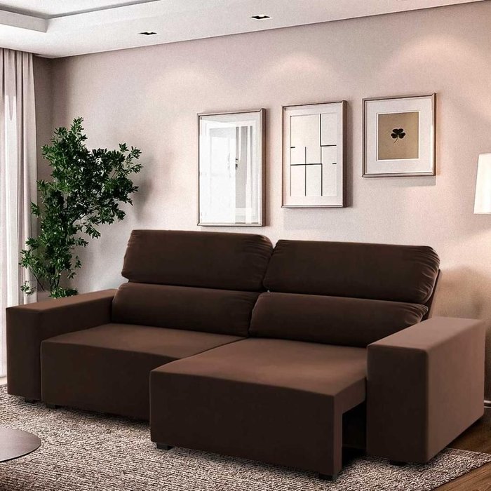 Sofá 3 Lugares Click Retrátil – Conforto e Elegância em Veludo MarromTransforme sua sala de estar em um ambiente acolhedor e sofisticado com o Sofá 3 Lugares Click Retrátil. Ideal para momentos de lazer com família e amigos, este sofá une design moderno, conforto superior e qualidade premium, tornando-se a peça central da sua decoração.Principais Características:Estrutura Resistente: Madeira de eucalipto de reflorestamento, garantindo durabilidade e robustez.Conforto Extra: Assentos com espuma D20 de alta densidade, proporcionando aconchego ideal para relaxar.Revestimento Premium: Tecido em veludo macio, toque suave e acabamento sofisticado.Design Retrátil: Assentos retráteis que oferecem versatilidade para leitura, descanso ou maratonas de filmes.Capacidade: Suporta até 90 kg por assento, acomodando confortavelmente 3 pessoas.Dimensões:Aberto: 100 cm (A) x 200 cm (L) x 144 cm (P)Fechado: 100 cm (A) x 200 cm (L) x 82 cm (P)Por que escolher o Sofá 3 Lugares Click?Perfeito para salas modernas, este sofá combina funcionalidade e estilo. Seu revestimento em veludo aliado à estrutura robusta garante conforto e elegância. A função retrátil adiciona praticidade para momentos de descanso ou convivência.Leve mais charme, conforto e sofisticação para sua sala de estar com o Sofá 3 Lugares Click Retrátil em Veludo Marrom. Adquira já o seu!