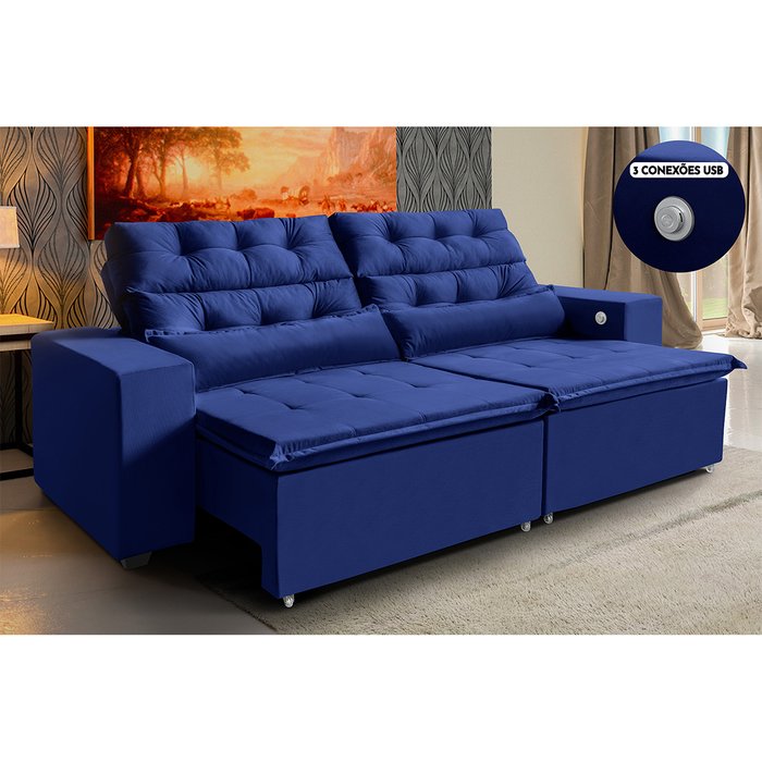 Sofá 4 Lugares América Azul Retrátil, Reclinável 2,52 Metros Tecnologia Carregamento 3 portas USB