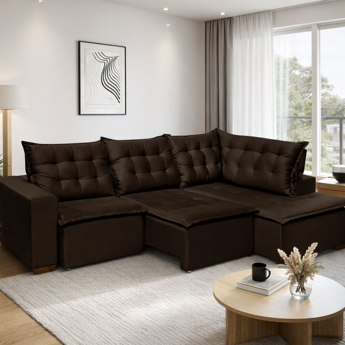 Sofá de Canto 5 Lugares Vitoria 270cm Retrátil e Reclinável com Tecido Veludo Nobre Sofatec Marrom